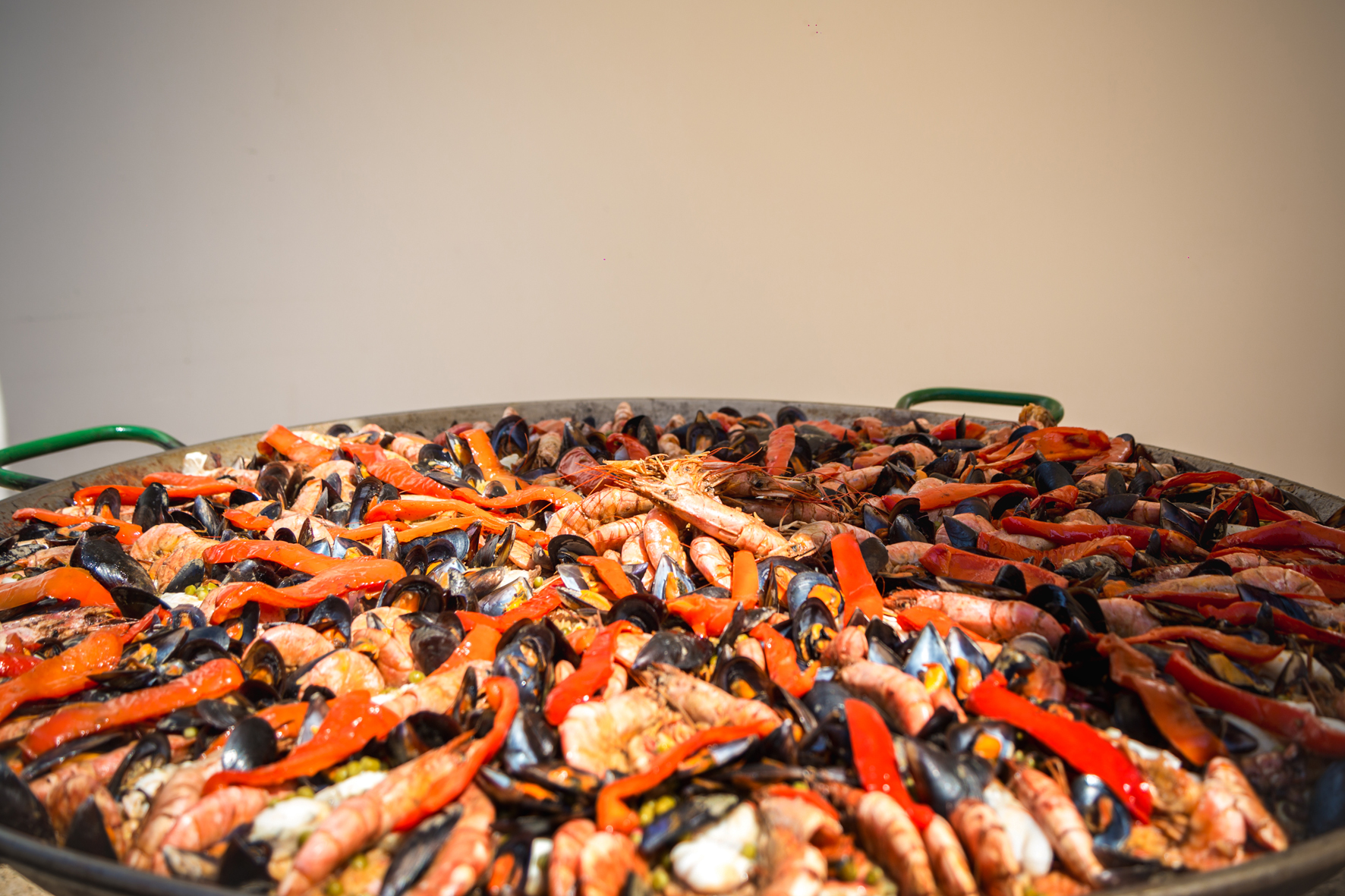 Riz, poulet, filet mignon, chorizo, poivrons, tomate, oignon, ail, fruits de mer, calamars, moules et 2 belles gambas par personne (Calibre16/20) Petit pois et naturellement épices qui vont bien !